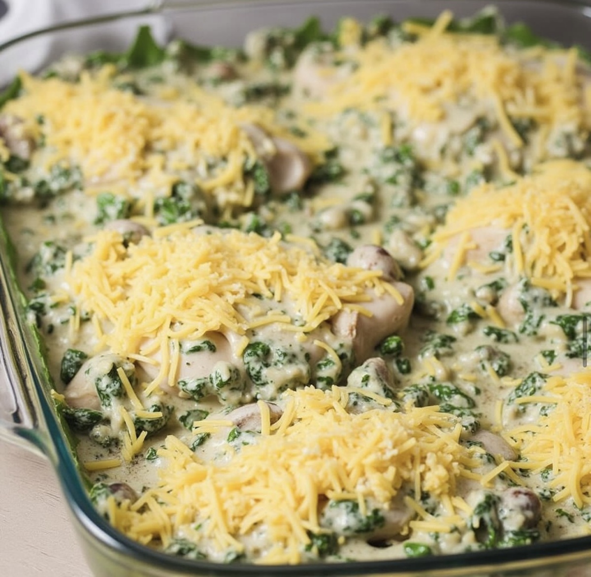 Запеканка с курицей, шпинатом и грибами в сливочном соусе