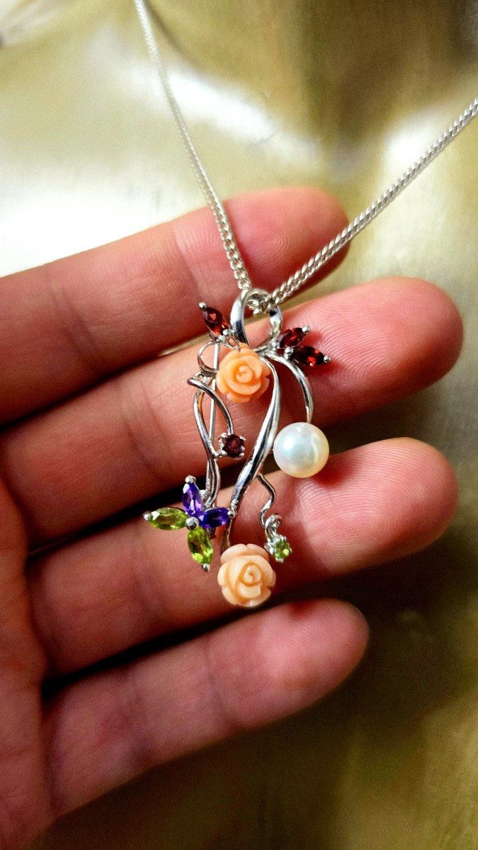 Брошь-подвеска, серебро 925 пробы, камни — аметист, хризопраз и гранат.