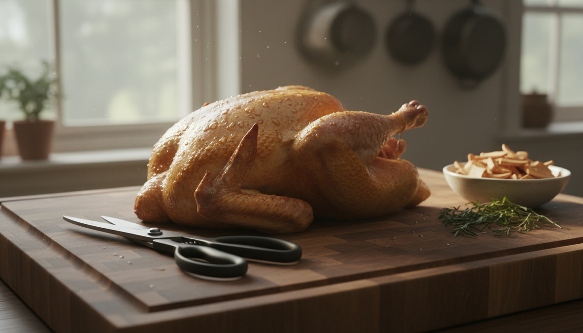 Сначала отделяйте бедра и крылья по суставам, затем грудку от киля. Режьте грудку тонкими ломтями поперёк волокон. Нож держите острым, делайте плавные срезы — сок остаётся в мясе.