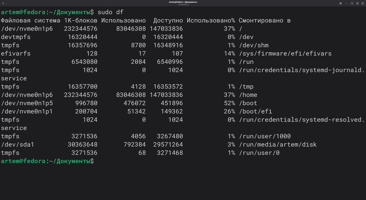 В Linux существует множество способов проверить, сколько места осталось на диске. Однако, в самой операционной системе уже встроен мощный и полезный инструмент - утилита df. Она расшифровывается как disk filesystem и предназначена для предоставления полной информации об использовании дискового пространства файловыми системами. Утилита отображает имя устройства, общий объем доступных блоков, общее дисковое пространство, использованное и свободное пространство, а также точки монтирования. Базовый вариант использования выглядит так: sudo df Для удобства восприятия данных, часто используют параметр -h, который преобразует размеры из байтов в более понятные килобайты, мегабайты и гигабайты. Если вам необходимо увидеть данные по всем смонтированным файловым системам, включая псевдофайловые, используйте df -a. Это дает наиболее полную картину. Для отображения типа файловой системы вместе с остальными данными, используйте ключ -T. Например, sudo df -T По умолчанию, размеры отображаются в байта