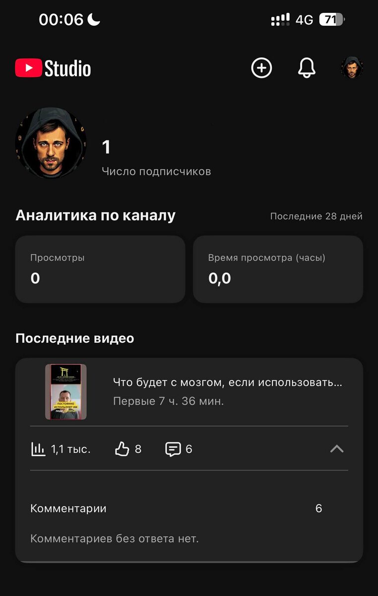 Ноль подписчиков. На старом было 2000. Полтора года работы, каждый подписчик — маленькая победа. Помню как радовался первой тысяче. Помню как отмечали с Миленой вторую — смешно вспоминать, но тогда это реально казалось событием. И вот я его убил. Своими руками. Экспериментировал с форматами, тестировал гипотезы, менял темы и подачу. Делал то, что считаю правильным — исследовал. Искал что работает. Алгоритмы такого не прощают. YouTube любит предсказуемость, а я кидал его из стороны в сторону несколько месяцев подряд. В какой-то момент канал просто умер — перестал показывать видео даже моим подписчикам. Охваты в ноль. Реанимировать бессмысленно, я видел такое у других — можно биться год и ничего не вернуть. Смотрю на пустой новый канал и ловлю себя на ощущении, которое ненавижу. Снова маленький. Снова в начале. Снова всё доказывать. Ощущение, будто полтора года работы просто испарились. Два дня до создания ходил с этим. Раздражало всё. Потом понял кое-что. Эти 2000 подписчиков стал