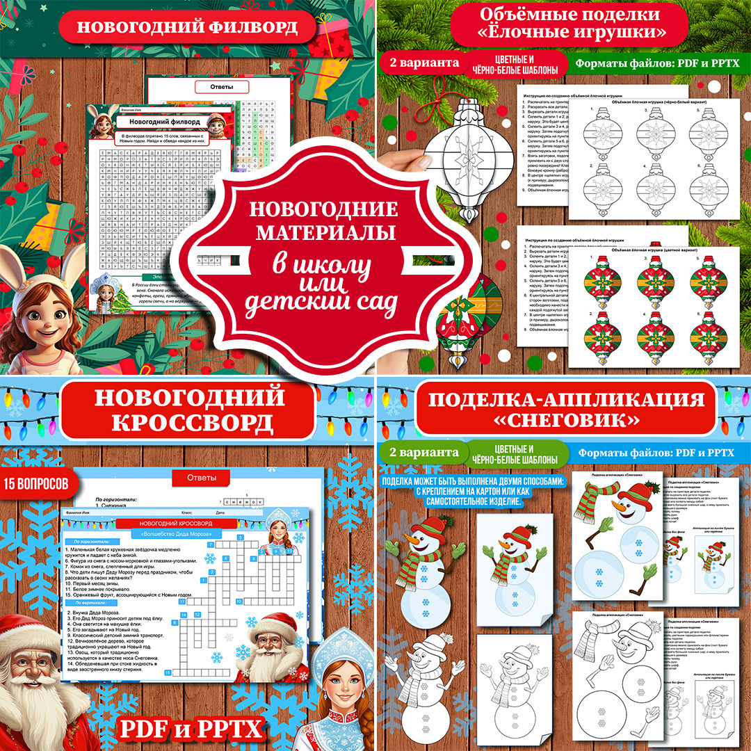 Скачивайте материалы к Новому году! 1. Новогодний филворд. Занимательный филворд к Новому году 2. Новогодняя поделка «Объёмная ёлочная игрушка». Поделки к Новому году 3. Новогодний кроссворд «Волшебство Деда Мороза». Зимний кроссворд для детей 4. Снеговик своими руками: шаблоны для зимней поделки. Новогодняя или зимняя поделка-аппликация «Снеговик» 5. Объёмная новогодняя поделка «Снежный шар в вязаных варежках» (может служить открыткой к Новому году) 6. Новогодние раскраски: комплект для урока, праздника и досуга. Зимние раскраски для детей 7. Новогодние закладки для книг. Книжные закладки «Новый год» 8. Новогодние закладки-раскраски для книг. Закладки для раскрашивания «Новый год» 9. Новогодние открытки 2026 — год Лошади. Комплект из 7 листов А4 с тёплыми пожеланиями (6 дизайнов открыток) 10. Поделка-аппликация «Новогодняя ёлка в русском стиле». Поделка «Ёлка» на Новый год своими руками (большое количество деталей для вырезания) 11. Новогодняя поделка «Русская народная ёлка» (аппликац