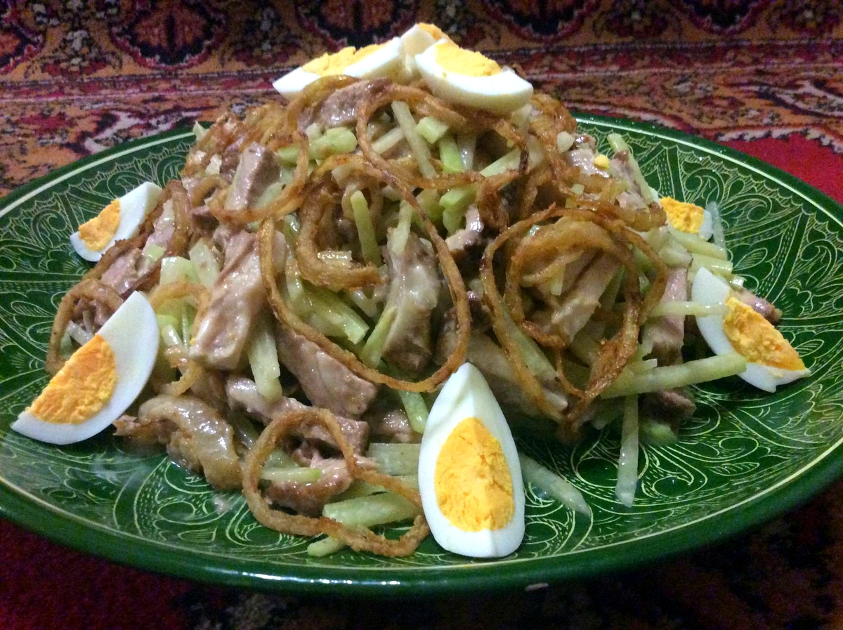 Название говорит само за себя. Сочетание отварной говядины, двух видов огурцов и тончайших яичных блинчиков создаёт настоящую текстуру праздника.