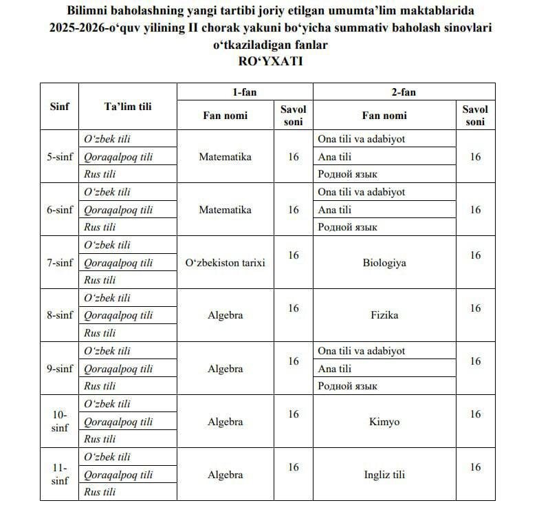 ! В школах Узбекистана с 18 по 25 декабря стартуют онлайн-суммативные оценочные тесты (СОЧ) за 2-ю четверть для 5–11 классов через платформу emaktab.uz. 🗓 График онлайн-тестов: ● 5 класс — 18 декабря ● 6 класс — 19 декабря ● 7 класс — 20 декабря ● 8 класс — 22 декабря ● 9 класс — 23 декабря ● 10 класс — 24 декабря ● 11 класс — 25 декабря 📄 Бумажные тесты пройдут 26 декабря. ✅ Родителям и ученикам важно заранее проверить доступ к платформе и подготовить устройства для тестирования. 👉 Подпишитесь и следите за актуальными новостями на нашем канале👇 👉 https://t.me/NewsAggregator_TT
