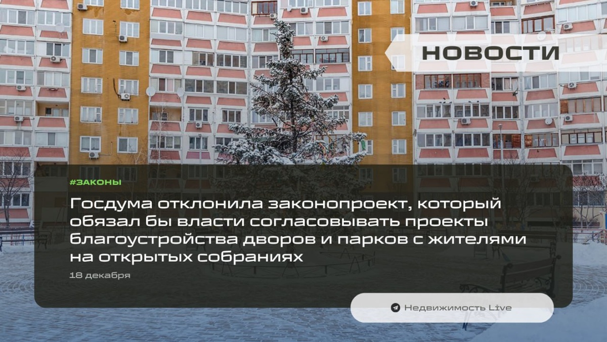 ⚡️ Госдума отклонила законопроект, который обязал бы власти согласовывать проекты благоустройства дворов и парков с жителями на открытых