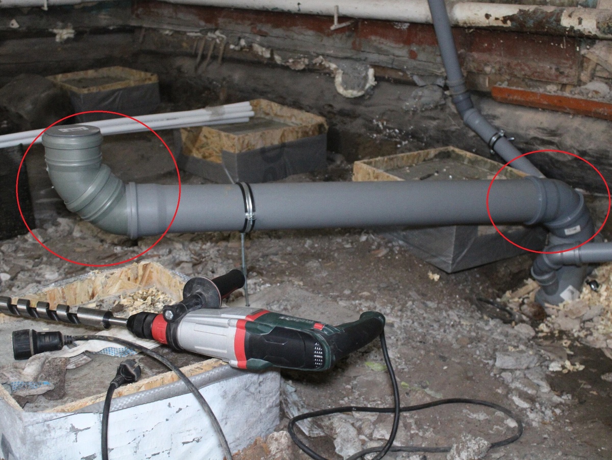 - отложения = засоры Поэтому нормальная практика делать поворот плавно, через 2–3 полуотвода по 45 градусов. На фото специально обвел: - слева три полуотвода