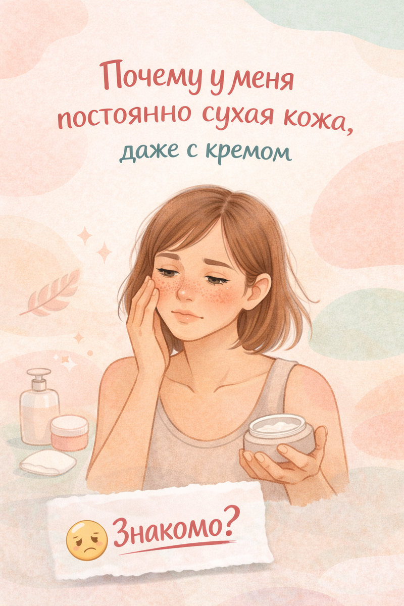 Я давно заметила одну странную вещь. Про сухую кожу люди говорят почти шёпотом. Как будто стыдно признаться: я мажусь кремом, но мне всё равно плохо. А ведь запрос один из самых частых: «Почему у меня постоянно сухая кожа, даже с кремом?» И за ним почти всегда — фрустрация. Раздражение. Ощущение, что с тобой что-то не так. Если ты узнала себя — оставайся. Я как раз про это. Давай честно. Ты, скорее всего: И вроде всё правильно. Но кожа всё равно: В какой-то момент появляется усталость. И мысль: «Ну значит, такая кожа. Что уж делать». Вот тут я хочу тебя остановить. Нам удобно думать, что сухая кожа — это навсегда. Как цвет глаз. Но в реальности чаще всего это состояние, а не приговор. И крем тут — только маленький кусочек пазла. Потому что кожа может быть сухой не потому, что ей мало крема, а потому что ей нечем удерживать влагу. Или потому что мы сами — из лучших побуждений — ей мешаем. Я собрала основные причины, которые вижу у себя и у других снова и снова. Мы редко связываем сухую