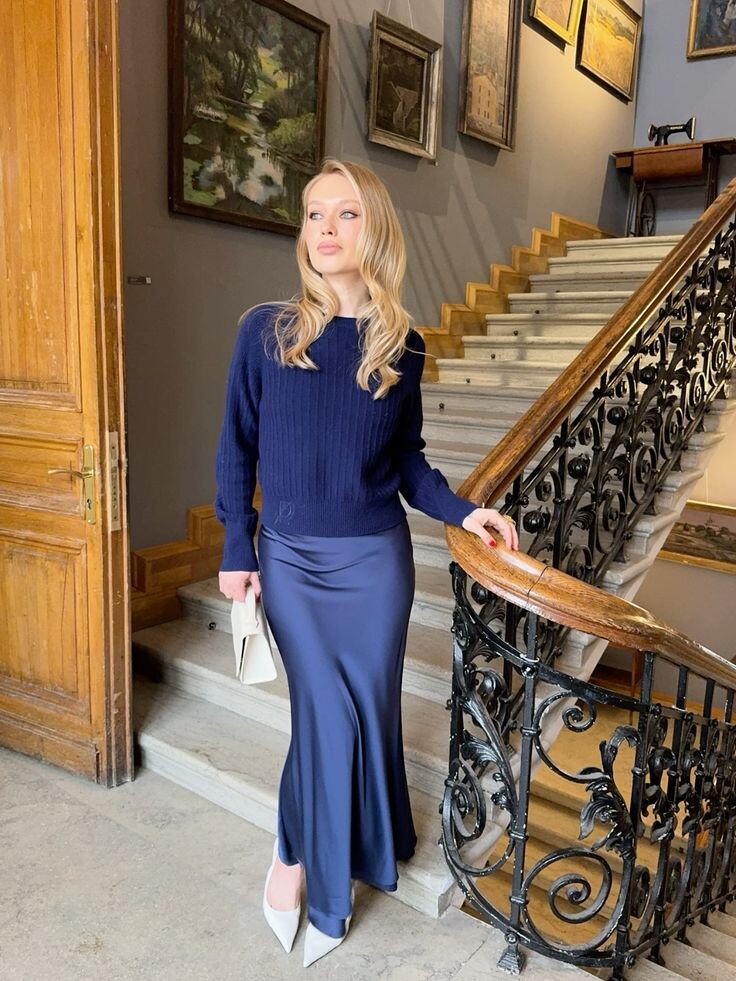 - Для романтического вечера: Шелковое платье-рубашка миди или атласная юбка-макси в цвете голубая ночь. Блеск ткани выводит глубокий синий на уровень чувственной, загадочной роскоши. Никакого пафоса, только благородное мерцание.