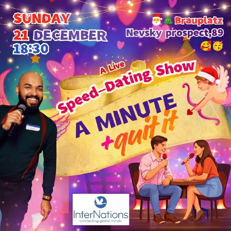 ! 🗓️ December 21, 18:30 — Dating a Minute + Quit It! A brand-new on-stage dating show from the creators of The More The Better quiz! Think speed dating — but funnier, faster, and with a live audience. We bring pairs on stage, ask playful and revealing questions, and let the crowd decide the best match with applause. Everyone gets a match card, and after the event we’ll share contacts only with mutual matches. With the New Year holidays approaching, a little extra love never hurts. Come for the laughs, the connections, and maybe your perfect December match! 🇬🇧 English and Russian languages. Bring your foreign friends! 🗓 6:30 PM, Sunday, December, 21 📍Nevsky pr., 89, Paulaner Brauplatz restaurant at COSMOS Hotel 💳 Fee: 600 rub. 👗Dress code: smart casual ✍️ Registration is obligatory: https://internations.timepad.ru/event/3718594/ __ Добро пожаловать на международный вечер знакомств! 18:30, воскресенье, 21 декабря, Невский пр., 89.