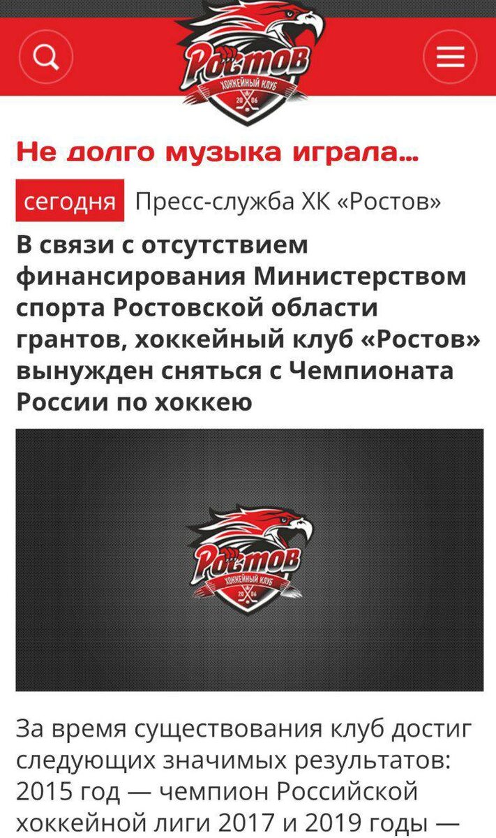 Хоккейный клуб «Ростов» снимается с чемпионата России из-за отсутствия финансирования со стороны областного Минспорта — по крайней мере, так