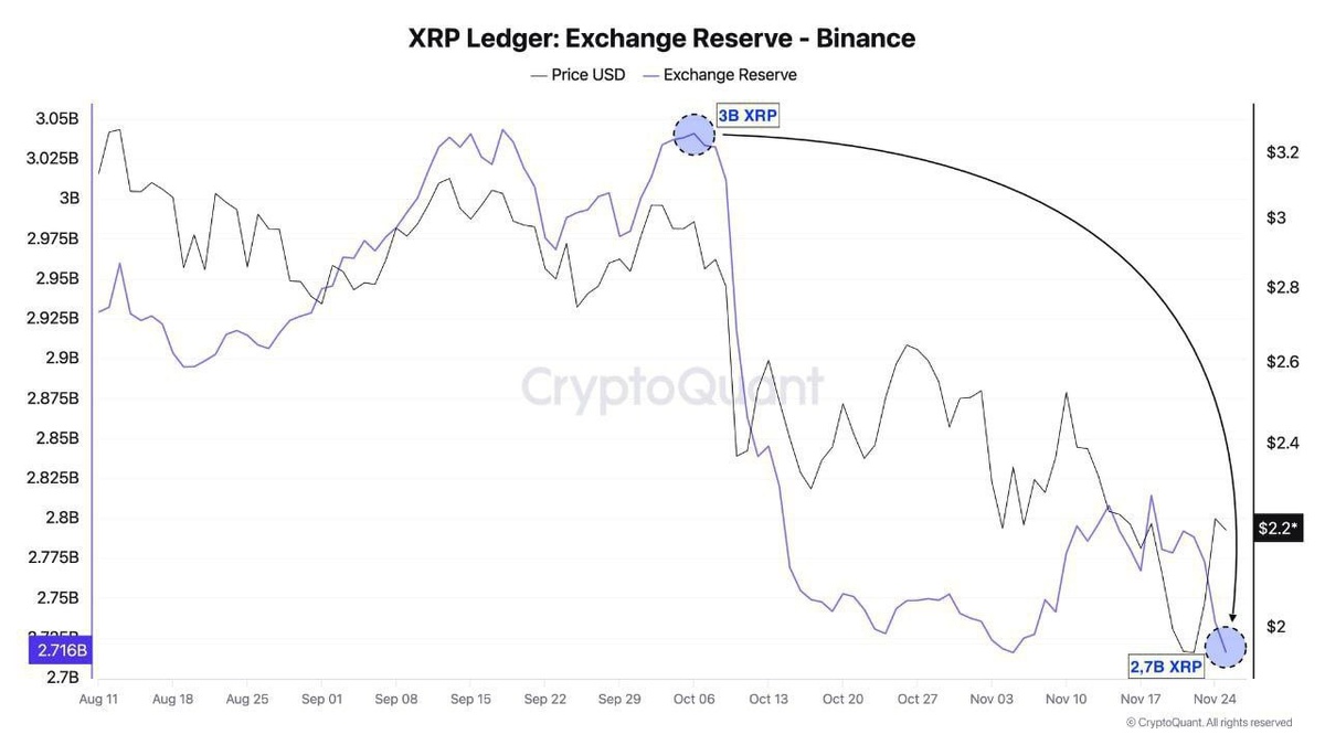 ! 🚨 XRP reserves are taking a nosedive! After all the buzz around a possible #XRP ETF, Binance is seeing some serious withdrawals (thanks, CryptoQuant)! 📉 Holdings are down to about 2.7B XRP—one of the lowest levels we've ever seen on the exchange. 💸 Since October 6, folks have pulled out around 300M XRP! Time to watch those wallets! 🧐💰