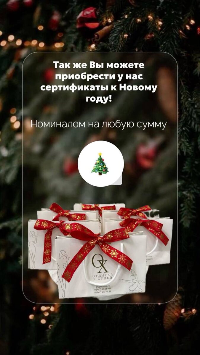 ! 🎉 Подарите себе или близким уникальный подарок — сертификаты в студию «Отдыхай и худей»! ✨ 🌿 Специальные программы для расслабления, восстановления и похудения помогут выглядеть и чувствовать себя лучше уже в НОВОМ ГОДУ. А приятная атмосфера и профессиональные тренеры сделают ваш путь к цели приятным и результативным. 🎁 Идеальный подарок на Новый год! Подарите заботу о себе и своих близких. Загляните к нам и приобретайте сертификаты прямо сейчас! Пусть 2026 год начнется с новых побед и отличного настроения! 💪🥂 ———⠀ ⠀ С любовью, команда студии коррекции и фигуры Отдыхай и Худей ✨
