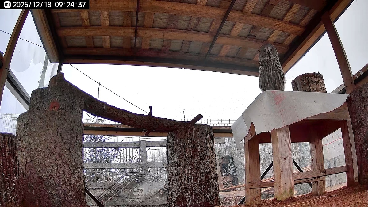 Выяснилось, что ночами Кофи стережёт границы вольера, шагает по брёвнышку, крутит головой и прыгает по пенькам. Дел невпроворот у совы!