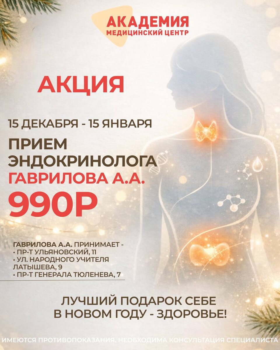 💥 Акция на приём к эндокринологу 👇 Гавриловой Анастасии Андреевне — всего за 990 ₽ 👩⚕️ Врач специализируется на диагностике и лечении гормональных нарушений, заболеваний щитовидной железы, сахарного диабета, нарушений обмена веществ и репродуктивной системы. 👉 Помогает найти причину, а не маскировать симптомы. 📅 с 15.12.2025 по 15.01.2026 приём по специальной цене — 990 ₽ 📍Врач принимает в филиалах МЦ «Академия»: • пр-т Ульяновский, 11 • ул. Народного учителя Латышева, 9 • пр-т Генерала Тюленева, 7 Понимание своего организма — лучший подарок себе в новом году. *акция распространяется только на данного врача - Гаврилова А.А Запись в клинику через👇 — телефон 📞 27-05-05 — сайт 🌐 academy-med.ru — телеграм 🌐 @Academychat73