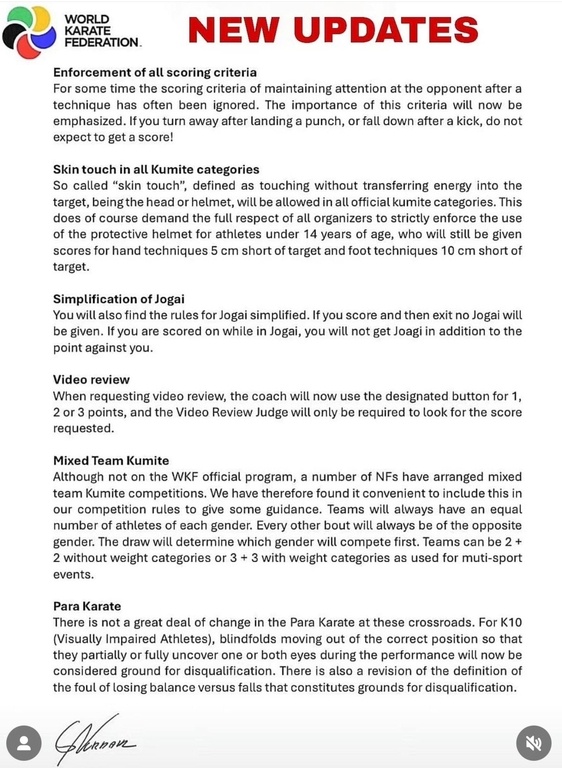 : . 🔹Если вы отвернетесь после удара или упадете после удара ногой - оценки НЕТ ❌ 🔹Касание головы или шлема разрешено во всех официальных категориях кумитэ. Также при наличии шлема у детей до 14 лет, 5 см от цели удара рукой и 10 см от цели удара ногой также оценивается. 🥊 🔹Если вы забираете бал, а затем выйдете за площадку, то «джогай» не будет начислен. Если вам пробьют бал во время вашего «джогай», вы не получите «джогай». ☝️ 🔹При запросе видеоповтора тренер будет использовать специальную кнопку для получения 1,2 или 3 баллов, а судье по видеообзору будет необходимо только просмотреть запрошенную оценку. 📌 🔹Смешанное командное кумитэ. В командах равное количество спортсменов каждого пола. Жеребьевка определит, какой пол выступит первым. Команды могут быть 2+2 без весовых категорий или 3+3 с весовыми категориями. 👥 🔹Для спортсменов категории К10 (спортсмены с нарушениями зрения), если повязка на глаза частично или полностью открывают один или оба глаза во время выступления -
