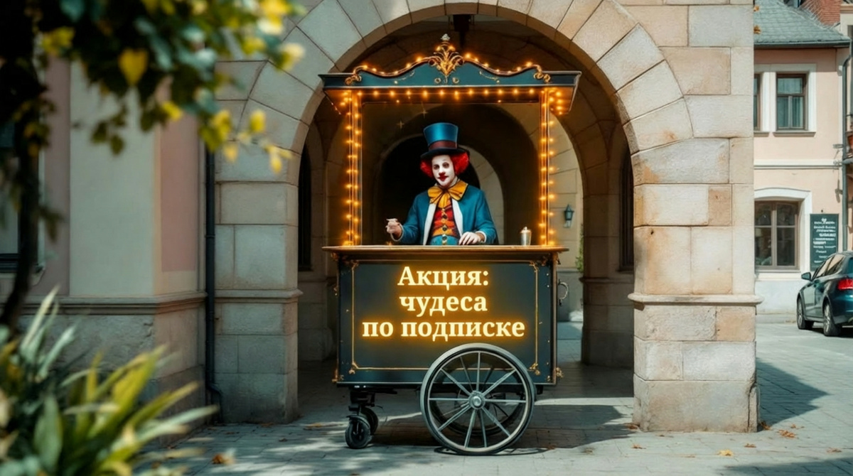 Тут во дворе появился необычный персонаж — мужчина в плаще инсценатора, тянущий за собой тележку с надписью “Акция: чудеса по подписке!”.