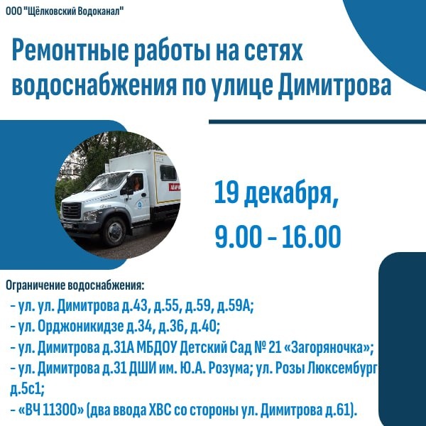 В связи с проведением аварийно-восстановительных на трубопроводе диаметром 150 мм (п. Загорянский, ул. Димитрова, д. 43), будет отключено холодное водоснабжение 19 декабря, с 9:00 до 16:00 по адресам: ➡️ ул. ул. Димитрова д.43, д.55, д.59, д.59А; ➡️ ул. Орджоникидзе д.34, д.36, д.40; ➡️ ул. Димитрова д.31А МБДОУ Детский Сад № 21 «Загоряночка»; ➡️ ул. Димитрова д.31 ДШИ им. Ю.А. Розума; ул. Розы Люксембург д.5с1; ➡️ «ВЧ 11300» (два ввода ХВС со стороны ул. Димитрова д.61). Приносим извинения за доставленные неудобства! 📞Телефон аварийно-диспетчерской службы: 8 496 562-11-72. Подписаться 🟦Вакансии 🟦Личный кабинет 🟦Чат-бот