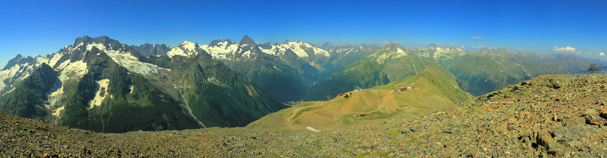 Вернусь на Кавказ в Домбай. Наследующий день после прогулки к Алибекскому водопаду ( https://dzen.ru/a/aUAdiahMInGNXTZO ) мы отправились на Вершину Муса-Ачитара на подъемнике. Это "развлечение" в конце мая я уже описывал в публикации (https://dzen.ru/a/aTmSN9smrj5pkLsK) но то был конец мая и горы были в снегу. В августе зрелище несколько отличалось. Во первых снег в большинстве случаев растаял и обнажились ледники. Небо было безоблачным. И ВАЩЕ было жарко. Но подъем на канатной дороги не требовал физических усилий. Поэтому мы ехали гулять без оных. Тем более, что за день до этого мы их в поисках тропы к Турьему озеру потратили достаточно. Как я уже писал снимать с первой очереди из застекленных вагончиков не сильно удобно. А вот кресельные (гондольные) дают полную свободу творчества, которой я и воспользовался Белалакая, Суфруджу и Зуб Суфруджу Водопад с ледника Джугутурлучат Джугутурлучат Аксаут и Алибекское узелье Сулахат Алибек, Эрцог и Алибекский ледник Джугутурлучат с первой в
