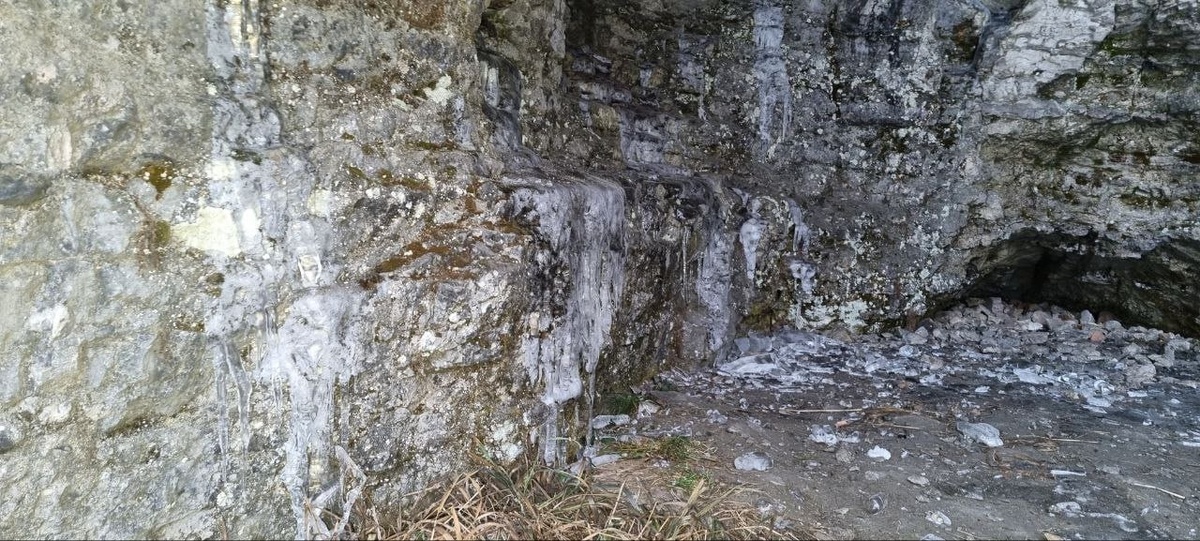 Малый Ветлан представляет собой компактный скальный выход, заметно уступающий по высоте своему «старшему брату». Тем не менее Малый Ветлан заслуживает персонального внимания благодаря своей необычной форме, системе небольших пещер, а также коллекции многочисленных окаменелостей на стенах . ❄️ Зимой в подобных пещерах гротах нередко наблюдаются явления образования сосулек как на потолках и карнизах (сверху), так и на стенах и выступах снизу. Образуются "ледяные сталактиты, сталагмиты и сталагнаты". ☃️ Сосулька — это кристаллическое образование из замерзшей воды. Классический сценарий включает капание воды с края свода: капля свисает, замерзает частично, образуя ледяную «насадку», к которой затем присоединяются новые порции воды, которые замерзают и удлиняют структуру вниз. Для их образования необходимо соблюдение нескольких условий: наличие источника жидкости, отрицательная температура среды, тепловой баланс между подводом и отводом тепла, ветровой и конвективный режим внутри грота, к
