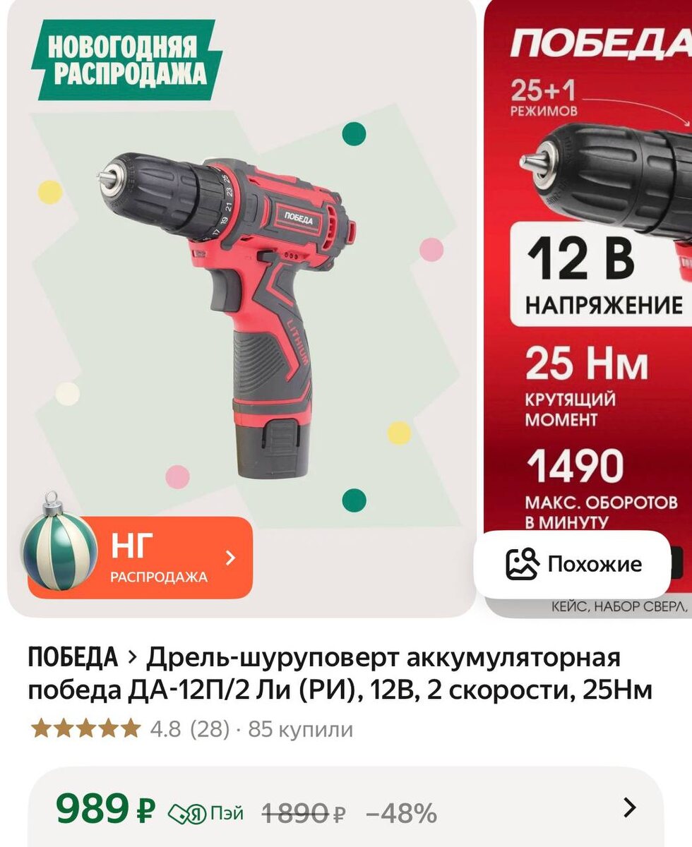 Дрель-шуруповерт аккумуляторная победа ДА-12П/2 Ли (РИ), 12В, 2 скорости, 25Нм