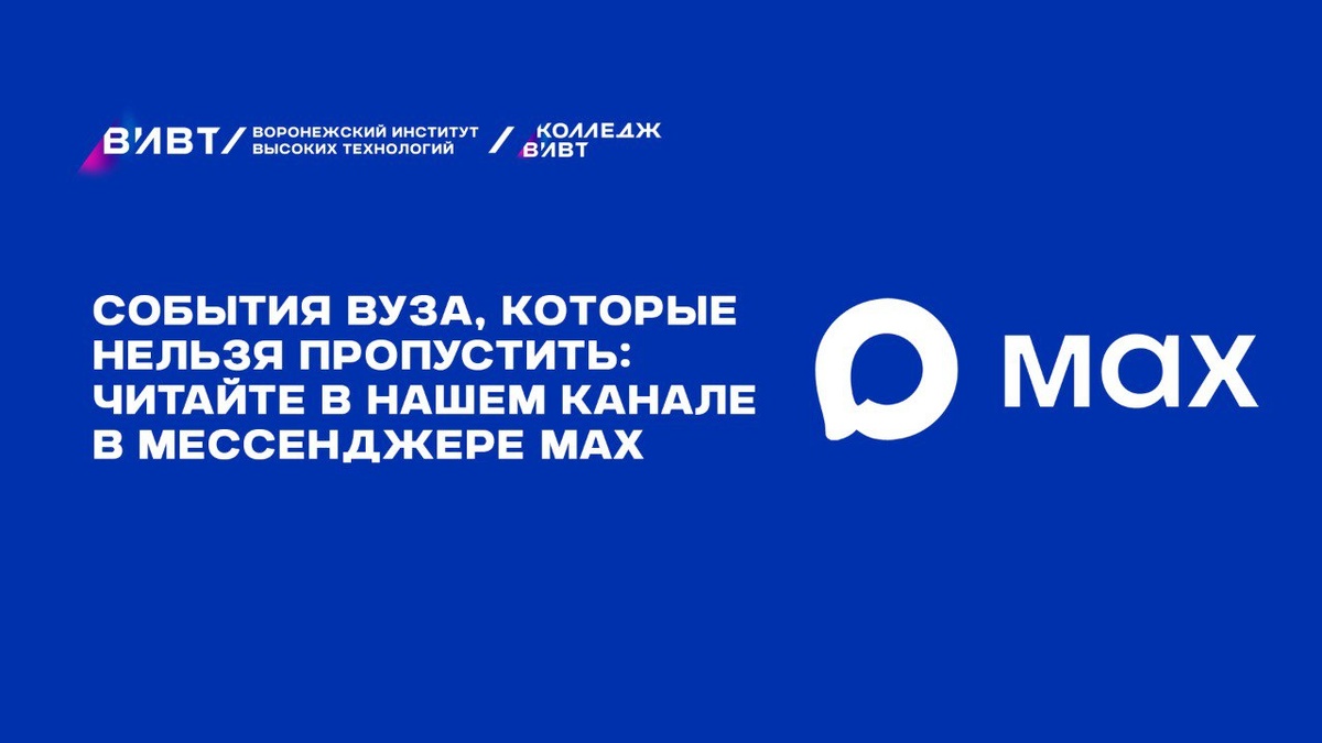 ! Мы рады сообщить о запуске официального канала ВИВТ в мессенджере MAX. Теперь вся важная информация о жизни нашего вуза будет ещё доступнее и оперативнее. Здесь вы всегда найдёте свежие новости, анонсы предстоящих мероприятий, важные объявления и полезную информацию об образовательных программах. Рекомендуем сразу настроить уведомления, чтобы не пропустить ни одного важного сообщения. Присоединяйтесь к официальному каналу ВИВТ в MAX - будьте в центре событий нашего института!