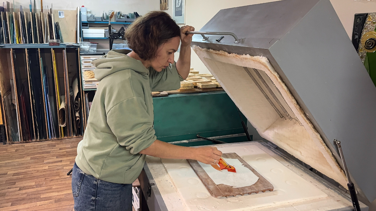 — Пусть будет 790 градусов, — решает она. — Стекло хорошо сплавится, но не станет плоским. Легкая фактура останется. Короткая выдержка — и начинается самый ответственный этап: контролируемое остывание. Печь медленно опускает температуру до 520 градусов — точки, в которой стекло «выравнивается», становясь устойчивым. Следующее снижение — до 400 градусов — занимает около часа. Это финальная ступень графика. После нее печь отключается, и изделие остывает уже самостоятельно, не спеша, до комнатной температуры.