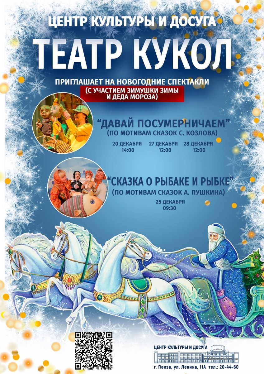 🏛 Малый зал ✅ «Давай посумерничаем» - 20, 27, 28 декабря (0+) 🌠 Это добрая история о друзьях, которые показывают маленьким зрителям, что жизнь легка и прекрасна, когда рядом есть друг ❤️ За приключениями трех друзей будет наблюдать интересно и детям, и взрослым👏 📝 Спектакль создан по мотивам сказок С. Козлова Анной Щепиной. ✅ Онлайн билеты: goo.su/ZVCQc 📞 20 44 61 _______________________________________________________________________ ✅Сказка о рыбаке и рыбке" - 25 декабря (0+) «Жил старик со своею старухой у самого синего моря…» – есть ли в России взрослый, который хотя бы раз не читал своему ребенку удивительные строки этой знаменитой пушкинской сказки?! Ответ очевиден: «Конечно же нет!». 🎭 Наш спектакль – это добрая и поучительная история, которая не только учит ценить то, что у нас есть, но и погрузит маленьких зрителей в чудесную атмосферу сказки. 📝 Спектакль создан по мотивам сказок А. Пушкина Анной Щепиной. ✅ Онлайн билеты: goo.su/2oqQ7zk 📞 Касса: 20 44 61