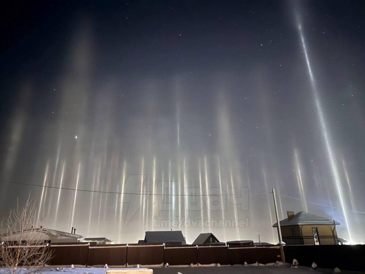 Это оптический эффект. Свет отражается от плоских ледяных кристаллов в морозном воздухе — так и появляются эти явления.