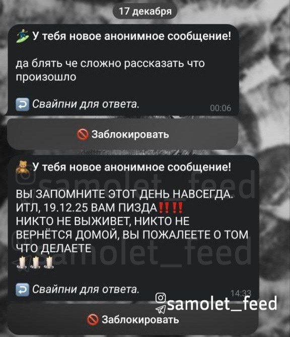 Админы группы "Подслушено ИТЛ" прислали скриншот из предложки. Сообщение с угрозой было прислано анонимно. В данный момент в лицее создан оперативный штаб, происходит взаимодействие с правоохранительными органами и администрацией города. Родителей и учеников просят не поддаваться панике. ________ Присылать новость @mstislavz 👉 Обсудить в чате ЖК 👉 Подписаться на канал 📲 Мы в MAX