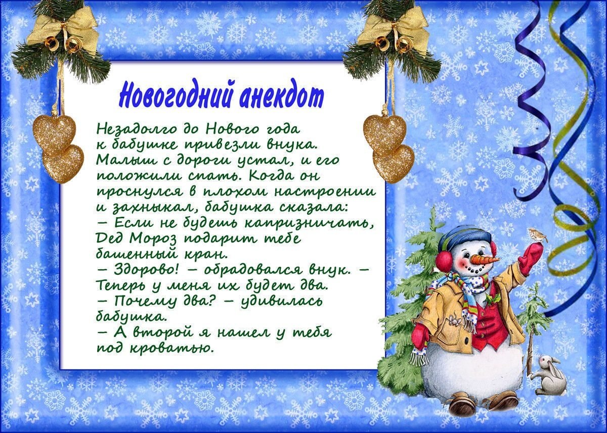 И Дед Мороз исполнил его желание. Теперь он работает инкассатором. * В Новом году Марина ждёт повышения зарплаты. На корпоративном празднике она не пила, а снимала всё на видео. * Акция: «Не трогайте, это на Новый год!» закончится 31 декабря. С 1 января начнётся другая: «Ешьте быстрей, а то испортится!» * Телеканалы быстро сообразили, что самое полезное, что они могут сделать для взрослых 1 января, - это весь день крутить мультики для детей. * Говорят, под Новый год все всегда сбывается, даже то, что целый год сбыть не получается. * - Какое самое неожиданное место, где вам приходилось встречать Новый год?