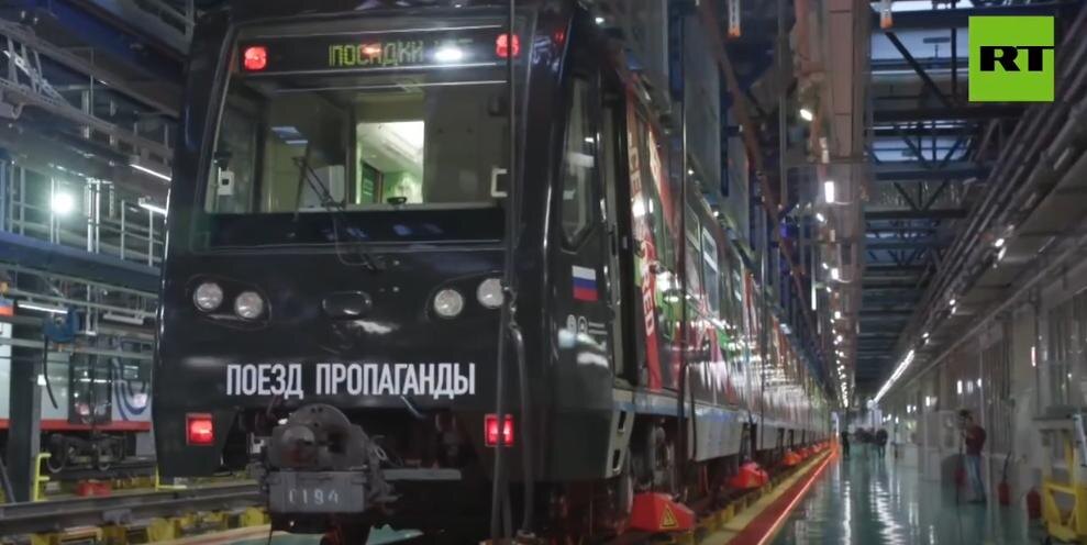 Тематический состав («Поезд пропаганды») на Арбатско-Покровской линии столичного метрополитена запустили в честь 20-летия телеканала RT.