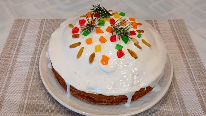 Всем приветик мои хорошие ! Я сегодня хочу предложить один рецепт прекрасного , вкусного кекса. Такой кекс можно испечь на Новогодние праздники . Кекс получается нарядный и очень вкусный . Что нам понадобится : 350 гр муки 4 яйца 180 гр сахара 10 гр ванилина щепотка соли 250 мл кефира 80 мл растительного масла 0.5 ч л куркумы Цедра одного лимона Цедра одного апельсина 10 гр разрыхлителя 5 гр соды Выпекать 50 минут под фольгой и еще 15 минут без фольги Глазурь: 2 белка 200 гр сахарной пудры 1 ч л лимонного сока Цукаты ,сухофрукты берем по Вашему желанию. И сколько хотим . В кефире загасить соду Смешиваем яйцо ,сахар ванилин, соль Натереть цедру апельсина и лимона. Вводим муку с кефиром и разрыхлителям . Немного замешав , добавляем сухофрукты и цукаты . Хорошо замешиваем тесто на столе. Форму хорошо смажем сливочным маслом и можно еще припылить мукой . Я еще на дно выложила пергаментную бумагу. Выливаем в форму тесто , немного разгладим . И убираем выпекать . Делаем глазурь . взбиваем