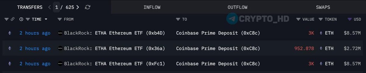 π ΠΠΎΠΌΠΏΠ°Π½ΠΈΡ BlackRock ΠΏΠ΅ΡΠ΅Π²Π΅Π»Π° Π΅ΡΠ΅ 6952 ETH ($20m) Π½Π° Π±ΠΈΡΠΆΡ Coinbase Prime β ΠΊΠΎΡΠ΅Π»Π΅ΠΊ