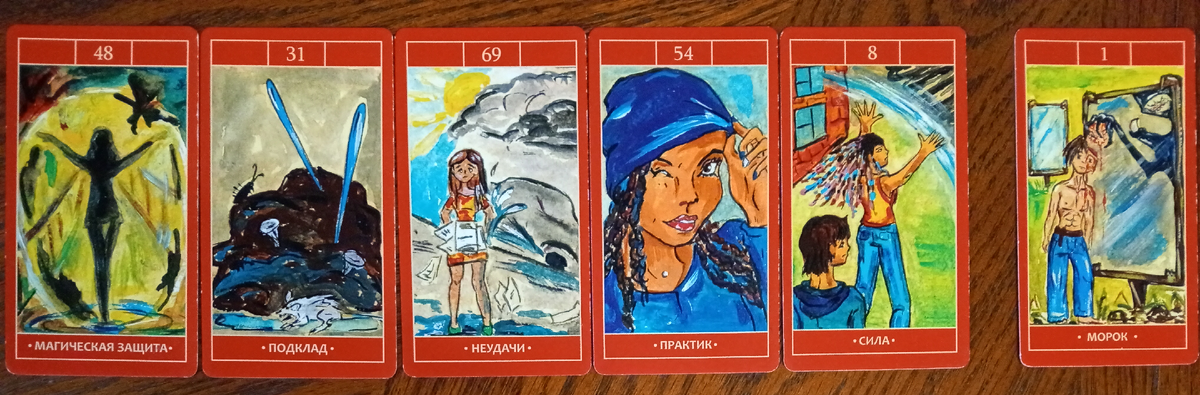 Вышли карты: "Магическая защита", "Подклад", "Неудачи", "Практик", "Сила". Для человека, который делал Подклад вышла карта "Морок". Карты показывают: у Вас есть магическая защита для сохранения Вашего здоровья, отношений, бизнеса (работы), имущества и многого другого. Магическая защита защищает Вас от магических нападений на Вас, так же защита отбивает атаки направленные на Вас. Магическая защита стала для Вас гарантом обретения спокойствия и уверенности в себя для реализации задуманных планов во всех сферах жизни. Благодаря ей Вы сможете быть счастливым человеком, не мучить себя мыслями, что Вам кто-то сможет навредить, кроме этого пропадает страх. Вы сможете подняться по карьерной лестнице (или уже поднялись), проявить себя в творчестве, наладить семейные отношения и многое другое. Так же карта "Магическая защита показывает, что у Вас есть сильная природная защита. Враг пытался (пыталась) Вам сделать Подклад на неудачи в жизни. Подклад это магический предмет, который заряжен негативн