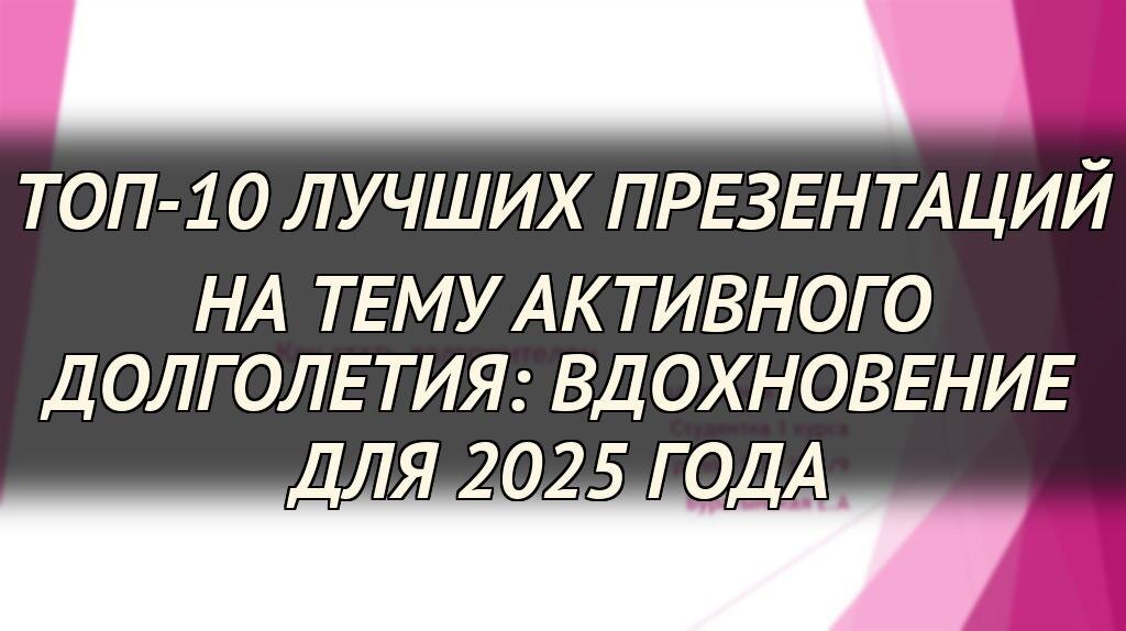 В этой статье мы собрали ТОП-10 лучших презентаций на тему активного долголетия, представленных ведущими специалистами в области гериатрии, фитнеса и психологии. Эти выступления, наполненные практическими советами, исследованиями и вдохновляющими историями успеха, помогут вам открыть для себя эффективные методы поддержания здоровья, мотивации и радости жизни независимо от возраста. Ознакомьтесь с этими отобранными презентациями, чтобы найти идеи, которые преобразят ваш подход к долгосрочному благополучию.
