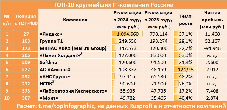 🔸Не дремлют и малыши. В десятке самых крупных IT-компаний России у Яндекса темпы роста выручки ниже среднего — лишь 37 % против средней в 43 %.