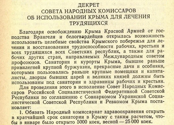 Благодаря освобождению Крыма Красной Армией от господства Врангеля и белогвардейцев открылась возможность использовать целебные свойства Крымского побережья для лечения и восстановления трудоспособности рабочих, крестьян и всех трудящихся всех Советских республик, а также для рабочих других стран, направляемых Международным советом профсоюзов. Санатории и курорты Крыма, бывшие раньше привилегией крупной буржуазии, прекрасные дачи и особняки, которыми пользовались раньше крупные помещики и капиталисты, дворцы бывших царей и великих князей должны быть использованы под санатории и здравницы рабочих и крестьян.
