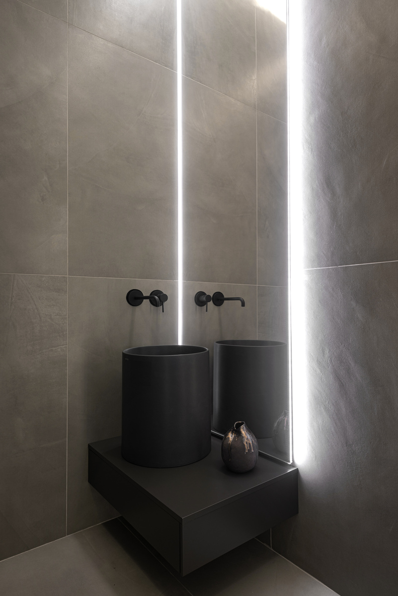 В СПА-комплексе каждый санузел воплощение красоты и функциональности. Общая стилистика выдержана во всех трех помещения, но также в оформлении каждого есть своя уникальная нотка, которая и делает комнату уникальной. Разные формы зеркал, современные и необычные отделочные материалы и, конечно, раковины, каждая из которых достойна отдельного рассказа. В первом санузле - редкое нестандартне решение, которое редко используется в квартирах, необычная раковина в виде бочки. Она выглядит очень красиво и крайне удобна. Конечно, такая раковина тяжелая и подвесная тумба делалась для нее под заказ. Используют такие раковины либо с напольными кранами, либо, как сделали мы, с краном из стены. Второй гостевой санузел - самый большой и здесь тоже главным украшением стала раковина из натурального камня. Ее вес около 37 кг и для того, чтобы она держалась была изготовлена специальная тумба. Самый большой плюс таких раковин не только их невероятная красота, но и уникальность. Все раковины из камня - разн