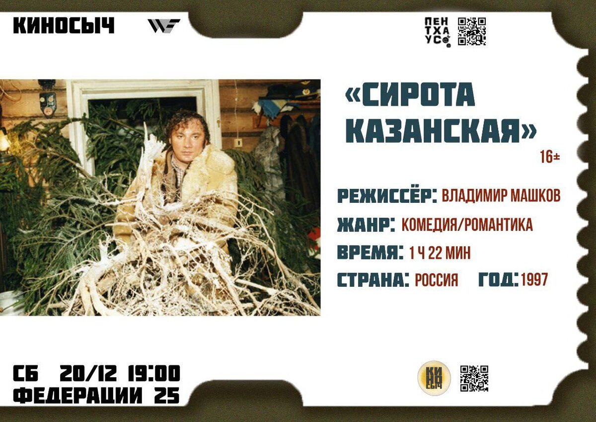 Режиссёр: Владимир Машков Жанр: Комедия, мелодрама Страна: Россия Продолжительность: 1 ч 22 мин 🗓️ 20 декабря 19:00 📍Федерации 25, через двор в ПЕНТХАУС Описание: В одной из русских глубинок живёт Настя, учительница начальных классов. Она никогда не знала кто ее отец, лишь только слышала историю от мамы: "Познакомились летом 1969 г., на черноморском курорте, в пансионате "Солнечный", зовут Павел". Чтобы найти отца, она дает объявление в газету, с надеждой на то, что в новогоднюю ночь ее мечта исполнится. Новогодняя, постсоветская трагикомедия в духе старой школы. Когда таких понятий как "франшиза", "продуктплейсмент" и "Бекмамбетов" не были в обиходе отечественного кинематографа. Ведущий: Андрей Патрин 🏷️ свободные взносы #20декабря25@culturnik
