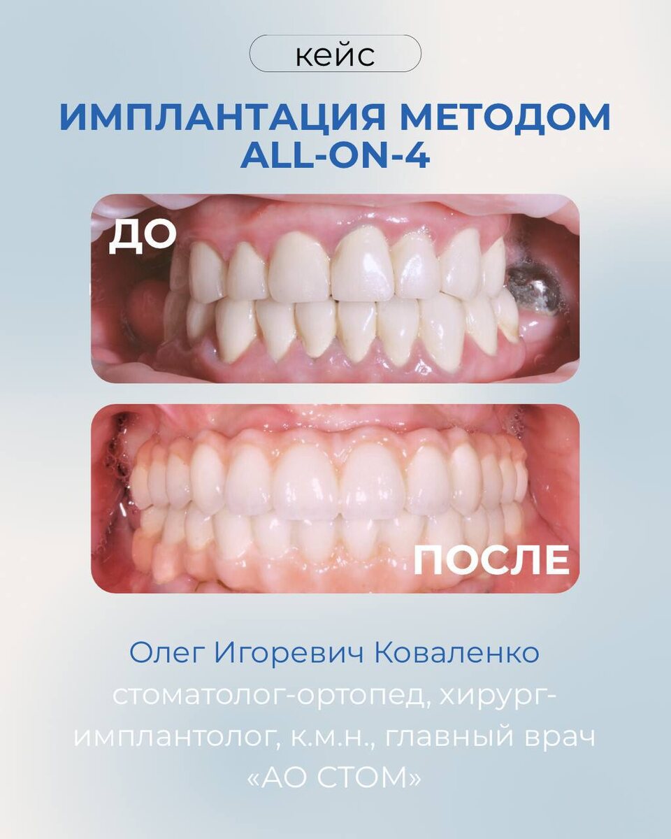 ✨ Так произошло и с нашей пациенткой — она обратилась в клинику АО СТОМ с пожеланием заменить старые металлокерамические коронки. Эстетика полностью перестала радовать, а иногда даже мешала улыбаться и чувствовать себя свободно. Пациентка попала на приём к врачу стоматологу-ортопеду, хирургу-имплантологу, кандидату медицинских наук и главному врачу сети клиник АО СТОМ — Олегу Игоревичу Коваленко 👨⚕️ После тщательной диагностики стало ясно: зубы под коронками сильно разрушены и восстановлению не подлежат 🚫🦷 Олег Игоревич предложил решение, которое дарит новые зубы и возвращает качество жизни — протокол All-on-4. Это когда несъёмный, эстетичный зубной ряд устанавливается всего на четырёх имплантатах — надёжно, комфортно и максимально естественное Операция прошла успешно. На время приживления имплантатов пациентке изготовили временные протезы, а затем установили постоянные оксидциркониевые конструкции с винтовой фиксацией — лёгкие, прочные и с естественной эстетикой 😍 Что получ