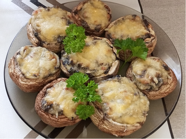 Самое простое и вкусное приготовление. Ингредиенты: - крупные шампиньоны – 8-9 шт., очень крупные шампиньоны 5-6 шт.; - сыр твердых сортов – 100 гр.; - майонез – 1 чайная ложка; - соль – по вкусу; - растительное масло для обжаривания шампиньонов. Шампиньоны промыть, вынуть ножку, мелко нарезать. Из шляпок шампиньонов во внутренней части аккуратно чайной ложкой вынуть часть мякоти, нарезать и обжарить на небольшом количестве растительного масла с нарезанными ножками. Для того чтобы грибочки получились более объёмными нужно дополнительно нарезать один, два гриба и обжарить вместе с остальными грибами или грибы обжарить вместе с мелко нарезанным репчатым луком. Сыр натереть на терке. Обжаренные грибы переложить в емкость смешать с майонезом и натертым сыром. Немного сыра оставить. Шляпки шампиньонов начинить обжаренными грибами с сыром присыпав сверху оставшимся сыром. Запекать в хорошо разогретой духовке при 180 гр. 10-13 минут до золотистой корочки. Приятного аппетита.