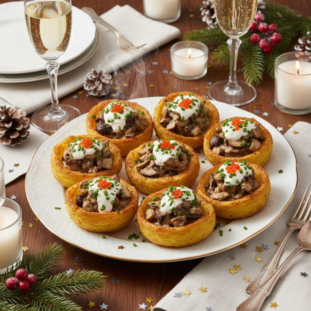 ” Ингредиенты ⤵️ 🔸Картофель — 1 кг 🔸Яйцо — 1 шт. 🔸Мука — 4 ст. л. 🔸Соль, перец — 1 щепотка 🔸Сливочное масло — 50 г 🔸Шампиньоны — 400 г 🔸Лук репчатый — 2 шт. 🔸Сметана — 100 г 🔸Растительное масло — 3 ст. л. 🔸Укроп - 1 пучок Приготовление🥔 1. Картофель отварить до готовности, слить воду, размять в пюре. Добавить яйцо, муку, соль, перец. Тесто должно быть мягким, но держать форму. 2. Для начинки: лук и грибы мелко нарезать. Обжарить лук до прозрачности, добавить грибы и жарить до испарения жидкости. Добавить сметану, соль, перец, тушить 5 минут. В конце добавить зелень. 3. Противень застелить пергаментом, слегка смазать маслом. 4. Картофельное тесто разделить на порции. Сформируй «гнёзда» с углублением в центре. 5. Наполнить углубления грибной начинкой. 6. Запекать в разогретой до 180°C духовке 25–30 минут до золотистого цвета. 7. Подавать горячими, украсив зеленью и сметаной. Рецепт дня #картофельные_гнезда #картофель #начинка #грибы #новогодний_стол