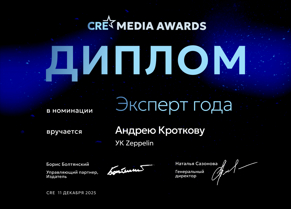 Генеральный директор и совладелец Zeppelin Андрей Кротков вошёл в первый медийный рейтинг CRE Media Awards и стал победителем в номинации «Эксперты года». Награждение победителей CRE Media Awards впервые состоялось 11 декабря в рамках итогового отраслевого мероприятия CRE X-MAS 2025, которое команда Zeppelin, конечно же, посетила! Премия учреждена издательским домом CRE и станет ежегодной традицией, объединяющей наиболее заметных и активных представителей рынка коммерческой недвижимости. Commercial Real Estate — ведущее отраслевое медиа о недвижимости в России. Медийный рейтинг CRE Media Awards формируется на основе вклада профессионалов в развитие отраслевого диалога и отражает «голос» рынка и экспертного сообщества, объединяя лидеров мнений и ключевых участников медиасистемы CRE. Номинация «Эксперты года» включает наиболее активных участников публикаций медиасистемы CRE — сайта, журналов и Telegram-канала. Это специалисты, при участии которых редакция на протяжении года создавала са