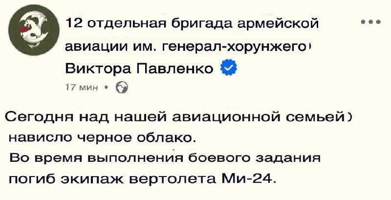 В ВСУ сообщили об уничтожении вертолета Ми-24 из 12-й отдельной бригады армейской авиации
