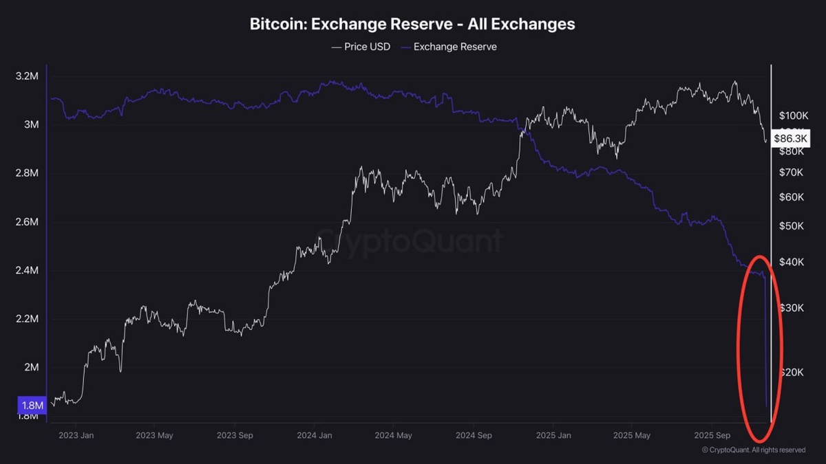 🚨 BTC supply on exchanges is disappearing! 🪙 Reserves just hit a multi-year low after a major drop