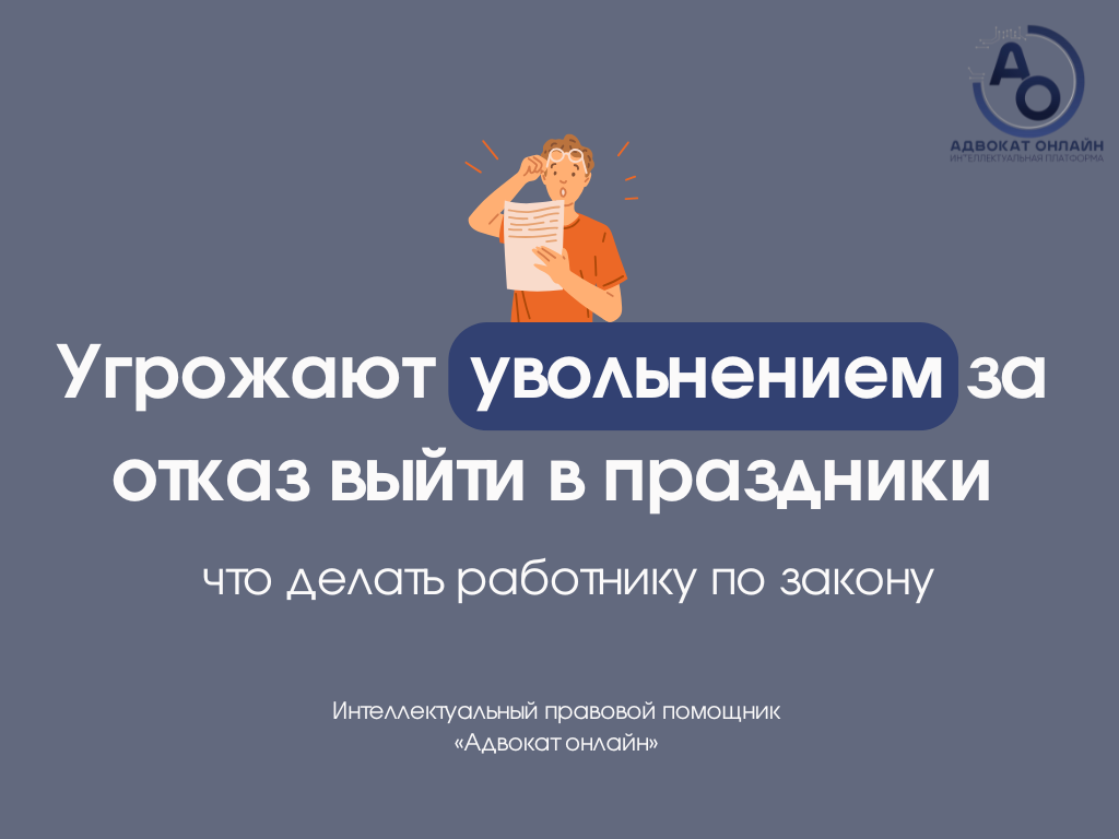 Ситуация, когда работнику звонят или пишут перед праздниками с требованием выйти на смену, знакома многим. А фразы вроде «если не выйдешь — уволим» вызывают тревогу и растерянность. Разобрали в статье, законно ли это, можно ли отказаться от работы в праздники и что делать, если работодатель угрожает увольнением. По общему правилу работа в нерабочие праздничные дни запрещена. Это прямо указано в статье 113 Трудового кодекса РФ. Привлекать сотрудников к работе в праздники можно только в исключительных случаях и при соблюдении строгих условий. В большинстве ситуаций работник имеет право отказаться — и это не считается нарушением трудовой дисциплины. Работа в праздничные дни допускается, если: — есть чрезвычайные обстоятельства (авария, угроза жизни, катастрофа);