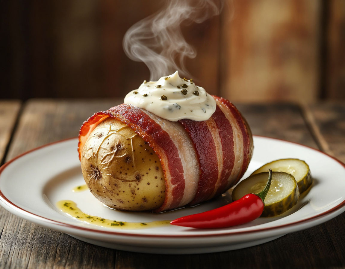 Вот сочный, ароматный и очень аппетитный рецепт запечённого картофеля, обёрнутого беконом и покрытого чесночным соусом — идеальное сочетание хрустящей корочки, нежной сердцевины и насыщенного чесночного вкуса.