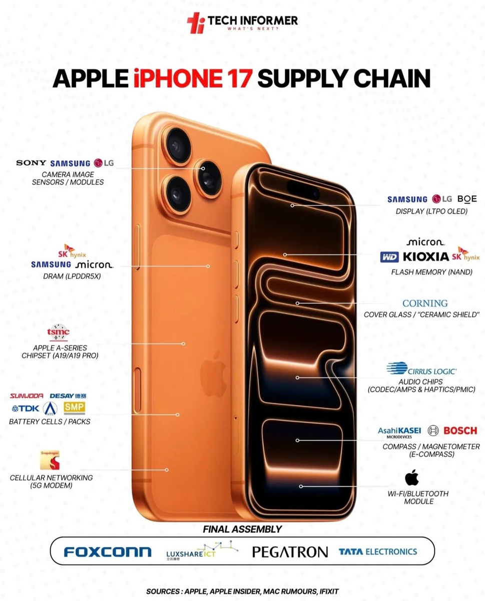 Визуализация дня: компании, которые так или иначе принимают участие в производстве iPhone 17 Pro. (via)