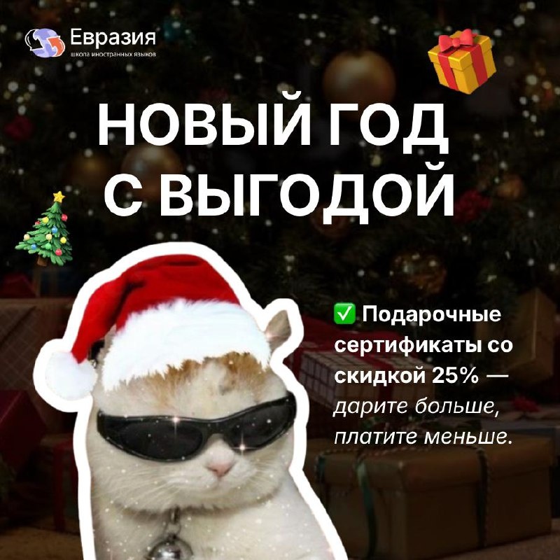 ! Есть мечты, которые мы всё откладываем: начать учить язык, попробовать новое направление, заняться образованием всерьёз. Новый год — тот самый момент, когда можно мягко и красиво дать этому начаться. Мы подготовили новогодние подарочные сертификаты со скидкой 25% — подарок, который действительно радует и остаётся с человеком надолго. Дарите больше — платите меньше: сертификат на 10 000 ₽ — всего за 7 500 ₽. ☃️Такой подарок подойдёт друзьям, семье, коллегам или вам самим — если давно хотелось, но всё не доходили руки. Праздничная акция действует только для новых учеников. Напишите ЗИМА С ЕВРАЗИЕЙ✨ в @Eurasia_online_help_bot — мы всё подскажем и зафиксируем скидку, пока она действует.