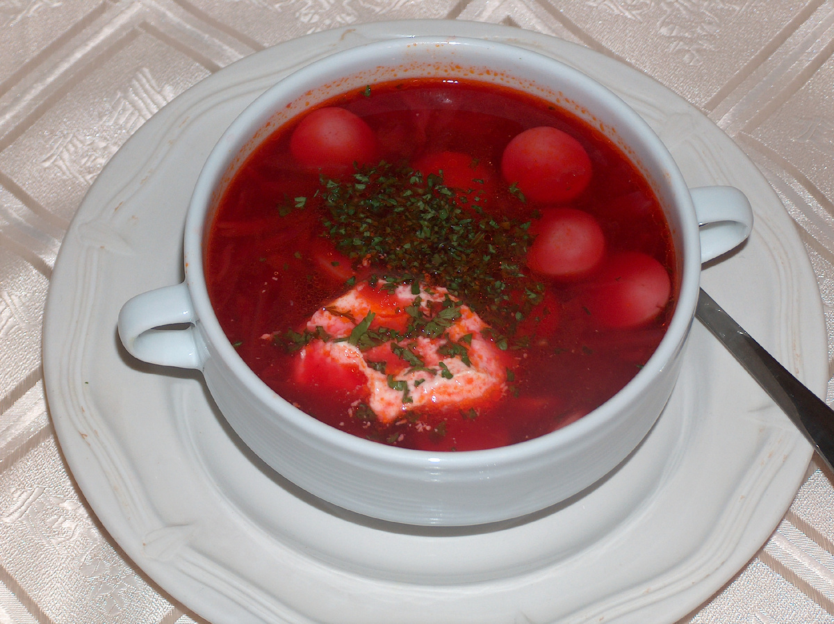 Если этого не сделать,расскажу,что происходит. Когда Вы закрываете крышкой кастрюлю, АККУМУЛИРОВАННОЕ ТЕПЛО действует на красящий пигмент( бетанин) разрушительно. Через некоторое время Борщ потеряет свой цвет. При открытой крышке этого не происходит. Борщ остывает и цвет сохраняется. Затем уже остывший Борщ можно убрать в холодильник и хранить до 5-ти суток. Разогревать частями,столько сколько надо. Обычно Борщ едят со сметаной и мелко рубленной зеленью. Можно добавлять чеснок и нарезанный зелёный лук. А если вы намажете свежий ржаной хлеб сливочным маслом и будете есть вместе с Борщом, это будет верх блаженства.